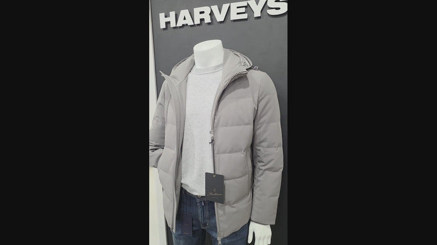 Men's MONTECORE padded parka in luxurious graphite grey technical stretch fabric.